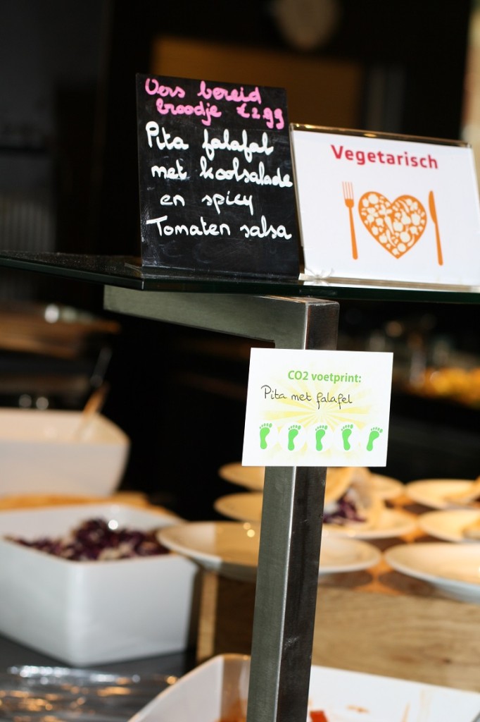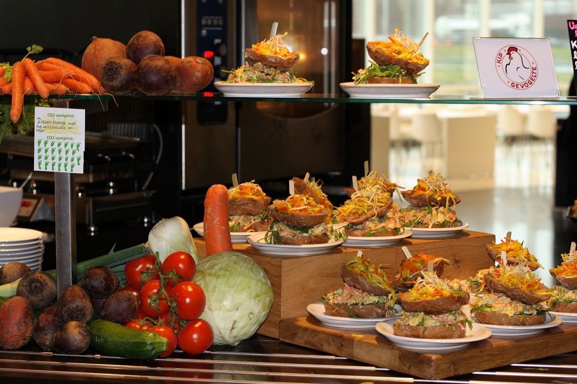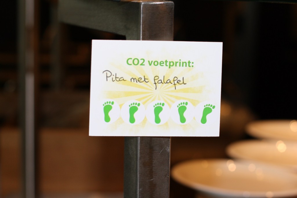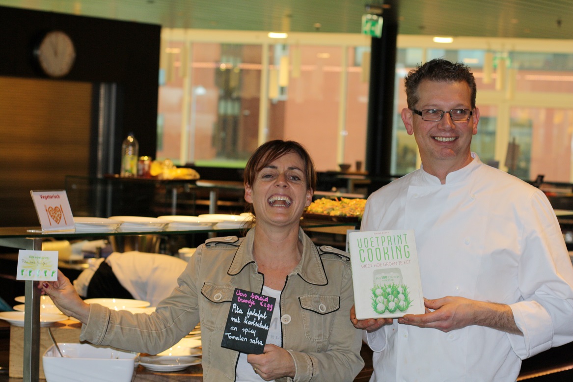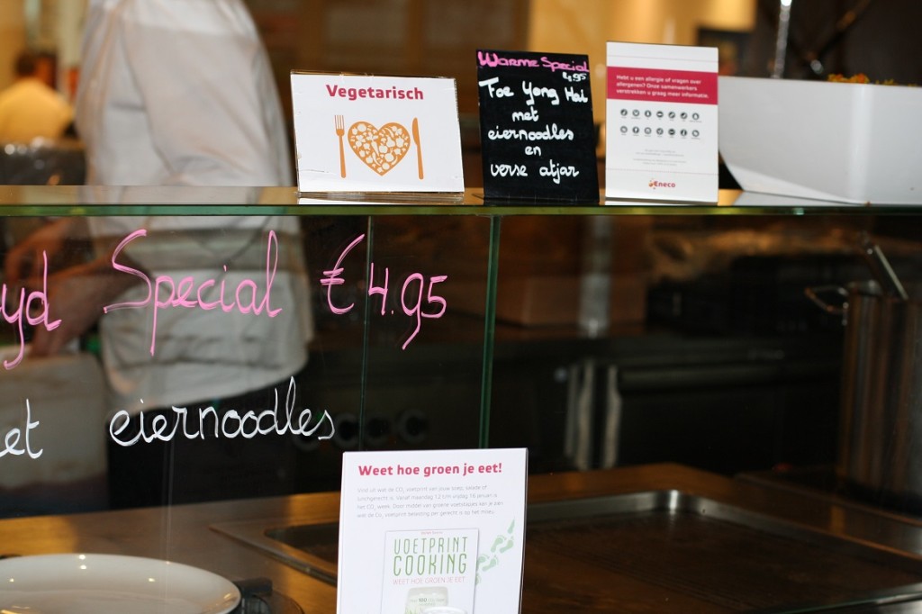 Hier een fotoverslag van de CO2-dieetweek (12 tot 16 jan) bij een grote Nederlandse energiemaatschappij. Deze week worden er in de bedrijfsrestaurants van de energiemaatschappij alleen CO2-lagere gerechten geserveerd. Denk daarbij aan wrap “duurzame vis”, chili sin carne, GaramMasala kikkererwten&crunchy papadum, no waste soep etc. De “CO2-dieet week” is een samenwerking van VoetprintCooking® en Hutten Catering. Ik ben zowel Hutten als de energie-maatschappij zeer dankbaar dat ze hun tijd in dit concept hebben gestoken en op die manier zo’n 700 medewerkers helpen bewust te worden van de CO2-uitstoot van ons voedsel! (30% VAN ONZE VEEL TE GROTE VOETAFDRUK)