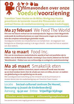 Transition Town Houten en de Milieu Werkgroep Houten presenteren de komende maand in Houten drie filmavonden met als centraal thema: de voedselvoorziening van onze maatschappij.