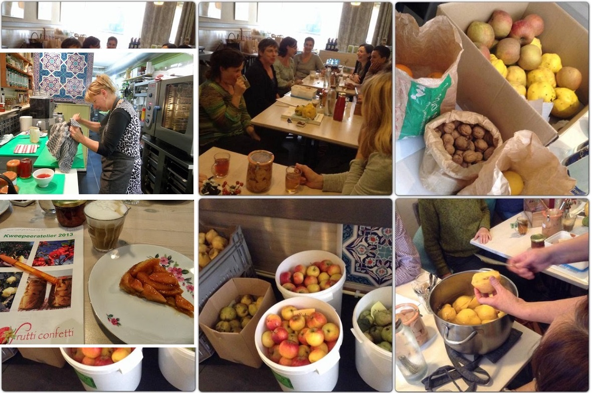 `VlamIndePan´ had haar deuren opengezet voor een waanzinnig leuke kweepeer-workshop van FruttiConfetti (Cokkie van Leeuwen): Je leert er bonbons, tarte tatin, likeur en meer maken. Ook wecktechnieken kwamen aan de orde. Je kunt ondertussen lekker babbelen met je vriendinnen onder het genot van een wijntje. Uiteraard wordt er geproefd. Uiteindelijk krijg je een hele rits aan overheerlijke producten mee naar huis in lieflijke potjes. Hoe het nu zit met de voetprint van dit al, daar ben ik nog niet uit. Het staat namelijk wel erg lang op het gasfornuis. Maar je moet dan ook naar de hoeveelheden kijken. Dus waarschijnlijk zoveel mogelijk kweeperen tegelijk koken.