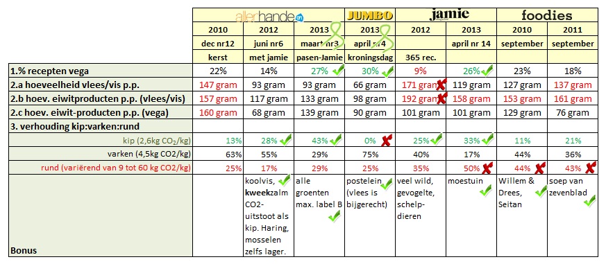 Daarnaast is er gekeken naar de vermelding van duurzaamheidsaspecten/keurmerken van de ingrediënten, recepten passend bij de seizoenen, producten van dichtbij/oud-hollandse recepten, de keuze van (duurzame) vissoorten. Bonuspunten verdient men met bv. tips tegen voedselverspilling en minpunten voor bv. lychees in september.