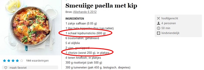 Voorbeeld: 600 gram kipdrumsticks (netto minstens zo’n 350 gram vlees) en 250 gram worst voor 4 personen. Dat is ruim boven de dagelijks benodigde hoeveelheid. >>
