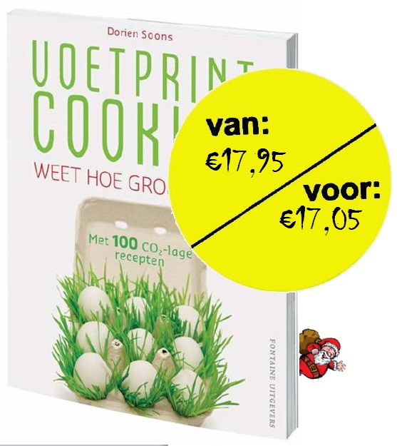 Wil jij graag een duurzaam kerstpakket? Kies dan voor het VoetprintCooking®-kookboek. Nu bij een afname van minimaal 25 boeken, een korting van 5%. Dat wil zeggen €17,05 euro voor een prachtig kookboek. (Zie hier een voorbeeld van Drukkerij Pascal, die met het kookboek een goed gevuld kerstpakket samenstelde.
