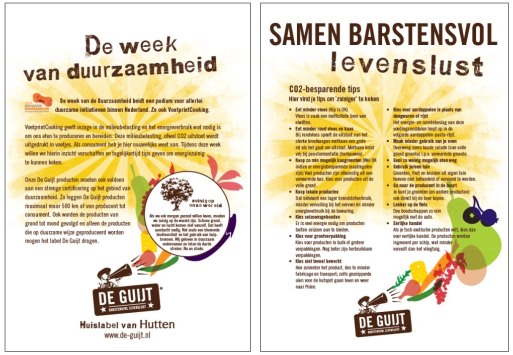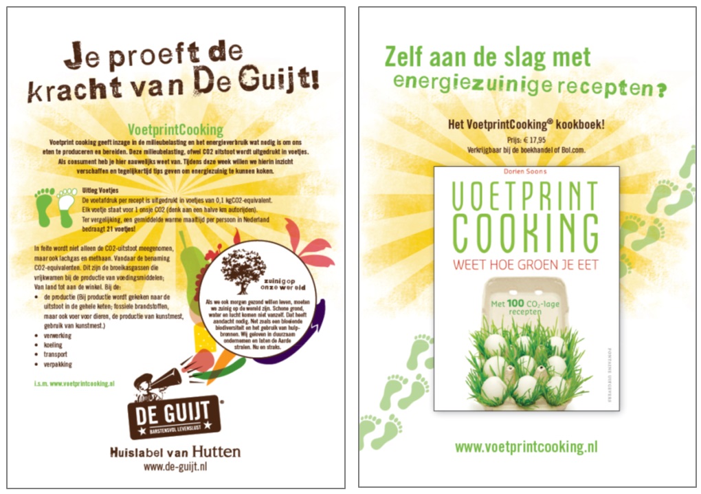 Cateraar Hutten en VoetprintCooking® implementeren samen een CO2-dieet in 2 grote bedrijfsrestaurants gedurende de week van de duurzaamheid. Hiervoor is communicatie-materiaal ontwikkeld door de marketing afdeling van Hutten-Catering in overleg met Dorien Soons: