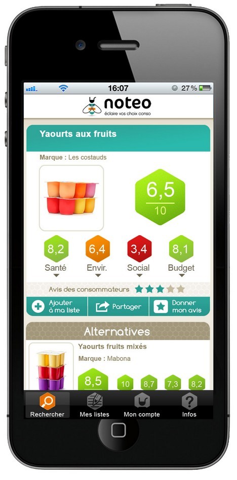 Het moet mij nog van het hart, dat ik ongelooflijk gezondigd heb tijdens deze lunch: Ik heb namelijk een salade met rundvlees gegeten. Het moet gezegd: Het was overheerlijk klaargemaakt. En het is wel zo dat gemiddeld genomen Nederlands rundvlees een betere milieuscore heeft dan Iers of Braziliaans rundvlees. Maar ook met een mooie app op zak, is het nog steeds zaak dat je de juiste productgroepen kiest en niet alleen de beste binnen een productgroep. Anders krijg je weer dat het de gezondste chips is binnen alle chipsen; Waarmee chips dus helemaal niet ineens gezond is ofzo. Gelukkig biedt de app je ook alternatieven.
