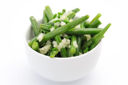 Wash the beans and cut off ends as required. Bring the beans to a boil with the lid on the pan: half under water with a little salt. Cook for 8 minutes. Pour off the cooking liquid. Mix the chili sauce with the beans. Chop an onion and mix it through raw.