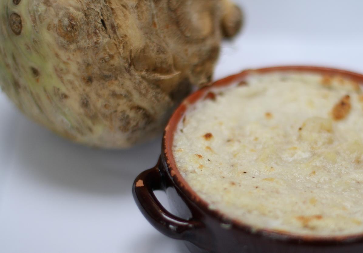 Peel the celeriac and cut into cubes. Add the celeriac cubes in a pan (preferably pressure cooker) with a layer of water pinch of salt and bring to the boil. Allow 10-15 minutes by boiling, in the case of an ordinary pan. Puree the soft celeriac cubes and the broth, 2 cups milk and salt / pepper. Mix 100 grams of grated cheese or cream cheese through it. Stir 3 egg whites. (Keep the yolk for example an omelette.) Divide the celeriac mash into 2 large soufflé dishes. Put 5 to 10 minutes in the oven at 200 degrees.