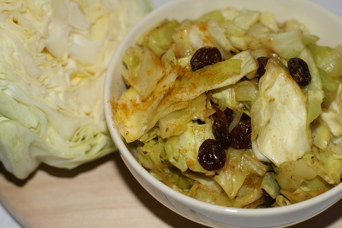 Cut the cabbage into pieces. Cook the cabbage with a good pinch of curry and a little salt for 5 minutes in a little olive oil. Peel the apple and cut it into pieces. Add the apple, raisins and a scoop of cinnamon to the cabbage and stir well.