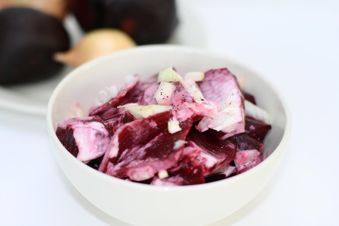 Cut the root of the beetroot and was the beetroot. Cut the beets into slices and halve them. Put the beetroot to the boil with the lid on the pan: half under water with a pinch of salt and a bay leaf. Cook for 40 minutes. (With a pressure cooker going faster) Pour the cooking liquid and discard the bay leaf away. Make a sauce of mayonnaise, yogurt and salt and pepper. Mix it with the beetroot. Chop an onion and mix it through raw.