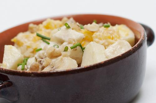 The celeriac peel, wash and grate. Divide the peeled apples, oranges and banana into pieces. Pour lemon juice over the fruit. Chop half the nuts finely. Mix everything together with mayonnaise. Season with salt and pepper. Serve waldorf salad with a few walnuts withheld.