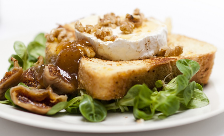 | 1/2 ongesneden witbrood 2 eetl. olijfolie 1 teen knoflook, geperst 200 g veldsla 300 g brie handjevol walnoten, gebroken honing vijgenjam 4 gedroogde vijgen |