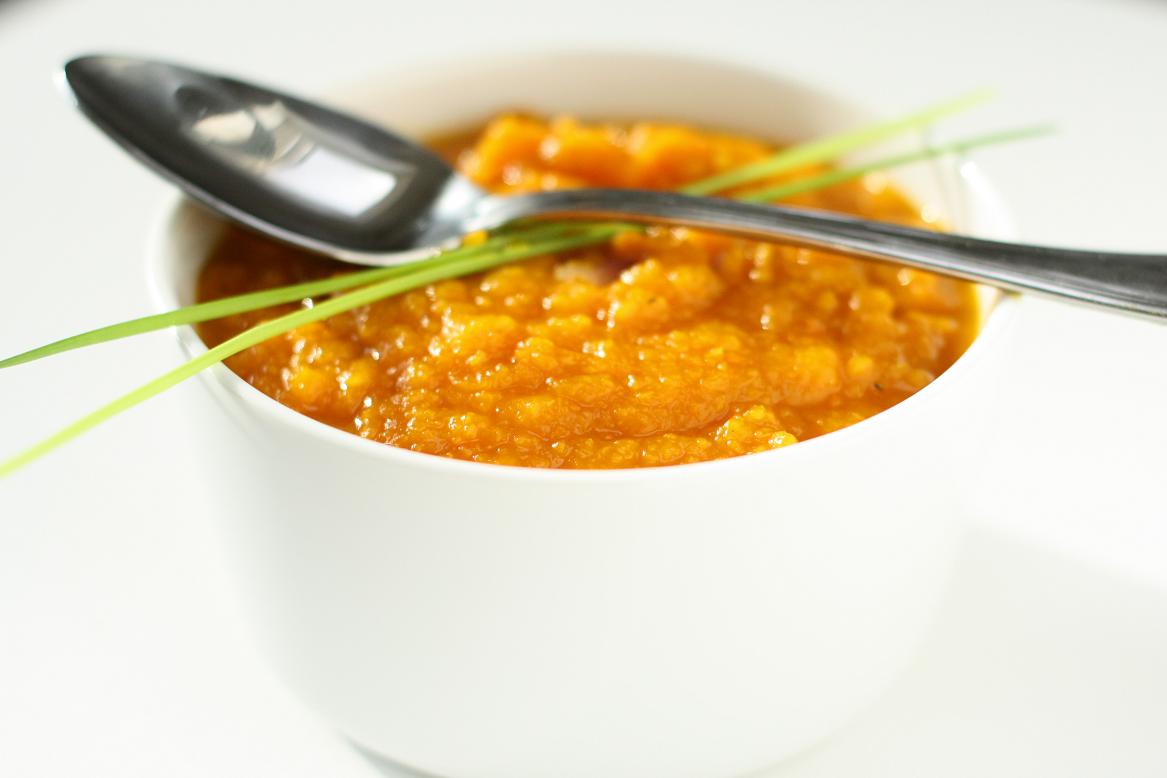 De pompoenschil kun je gewoon eten, dus die hoeft niet te worden geschild. Verhit de boter in een pan en fruit hierin de kleingesneden ui en het uitgeperste teentje knoflook 3 minuten. Haal de draden uit de pompoen en snijd hem met schil in kleine stukken. Voeg de blokjes pompoen en de bouillon toe en breng het geheel aan de kook. Draai de hittebron laag, leg een deksel op de pan en laat de soep ca. 10 minuten zachtjes koken. Pureer de pompoen met de staafmixer. Voeg de smeerkaas toe. Maak de soep op smaak met wat zout, peper, kerrie, nootmuskaat en komijn. Dien de soep op en strooi de walnootstukjes over de kommetjes. |