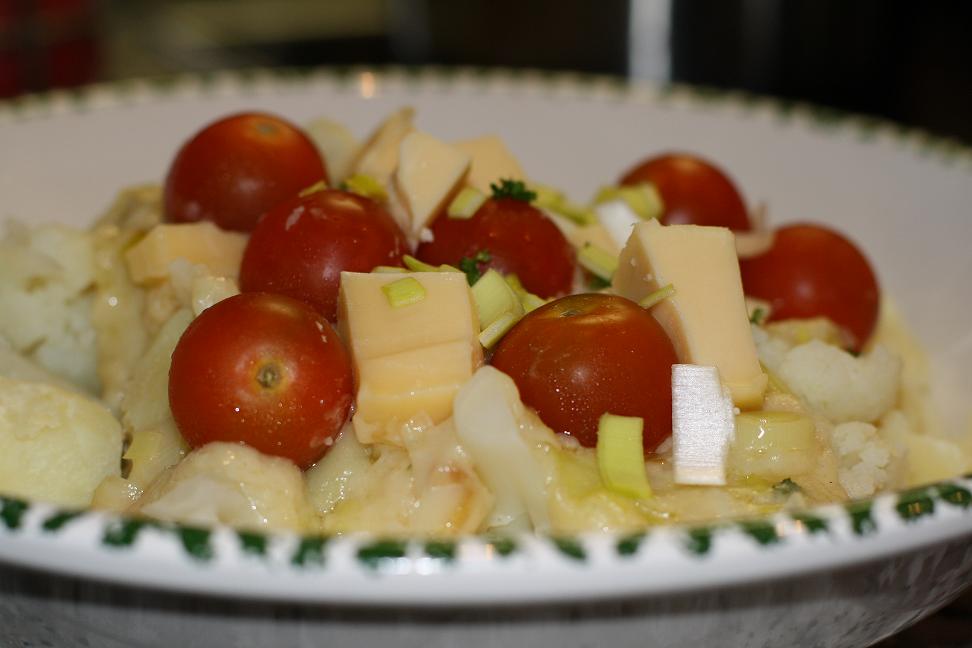 Let op: dit recept is alleen snel klaar, wanneer je een doorgewinterde aardappelschiller bent. Schil de aardappelen en snijd ze in 3 stukken en laat ze 20 minuten koken (na 5 minuten mag de bloemkool erbij); Was de bloemkool en snijd ze in roosjes en laat ze 10-15 minuten met de aardappels meekoken. Smelt de boter (laat deze niet bruin worden) en bak de prei en knoflook, voeg de bloem toe en roerbak alles 1 minuut (vuur laag). Neem de pan van het vuur en voeg geleidelijk melk, 50 gr kaas, paprikapoeder en de helft van de peterselie toe. Zet de pan weer op het vuur en breng de saus al roerende aan de kook, voeg zout en peper toe. Voeg kookvocht toe totdat de saus de juiste dikte heeft bereikt. Schep de uitgelekte bloemkool, aardappels en tomaatjes in een schaal. Giet de saus erover en de rest van de kaas. Maak af met peterselie, resterende blokjes kaas en gemalen peper ter decoratie. |